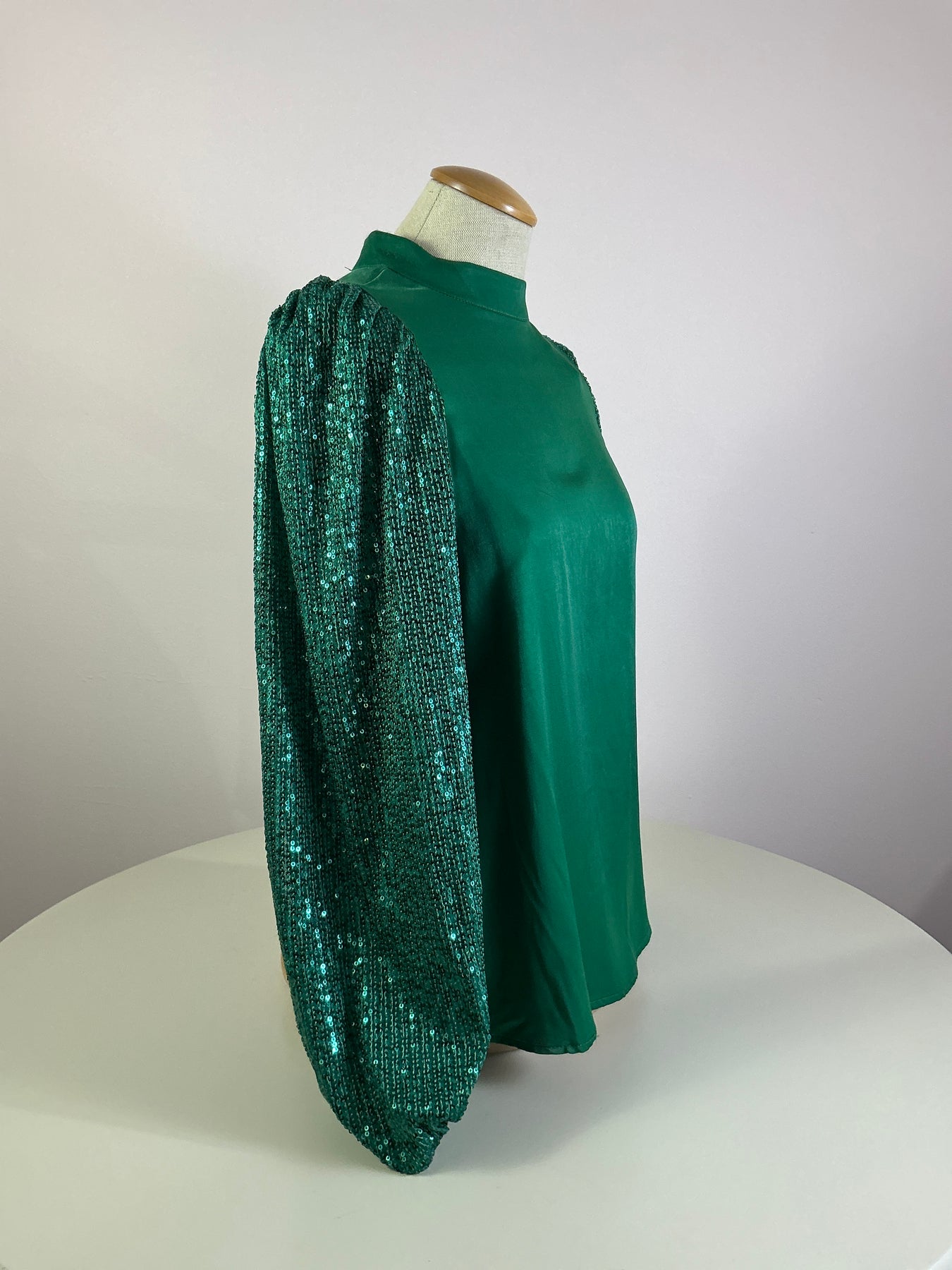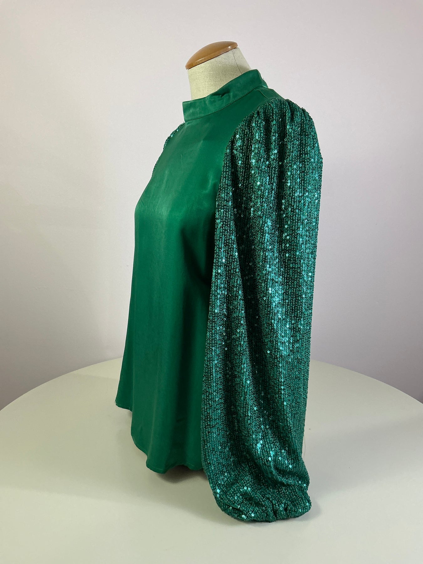 Embrace a confident and dazzling look with our Melanie Top-Green Sequin-Michelle McDowell. This top boasts long sleeves adorned with sparkling sequins, perfect for adding a touch of excitement and glamour to any outfit. Its luxurious fabric will make you stand out and radiate warmth at any occasion. Dare to make a statement and elevate your wardrobe with this bold and stunning piece.
