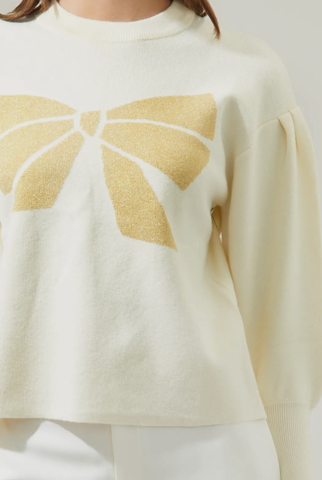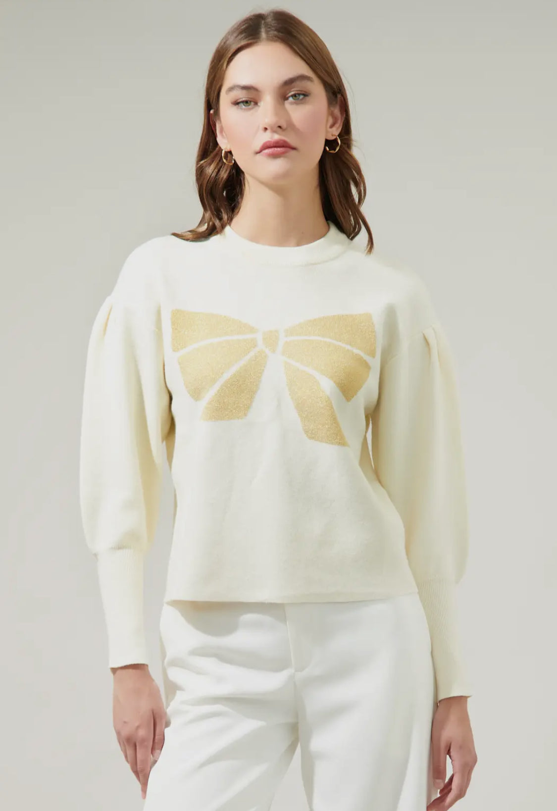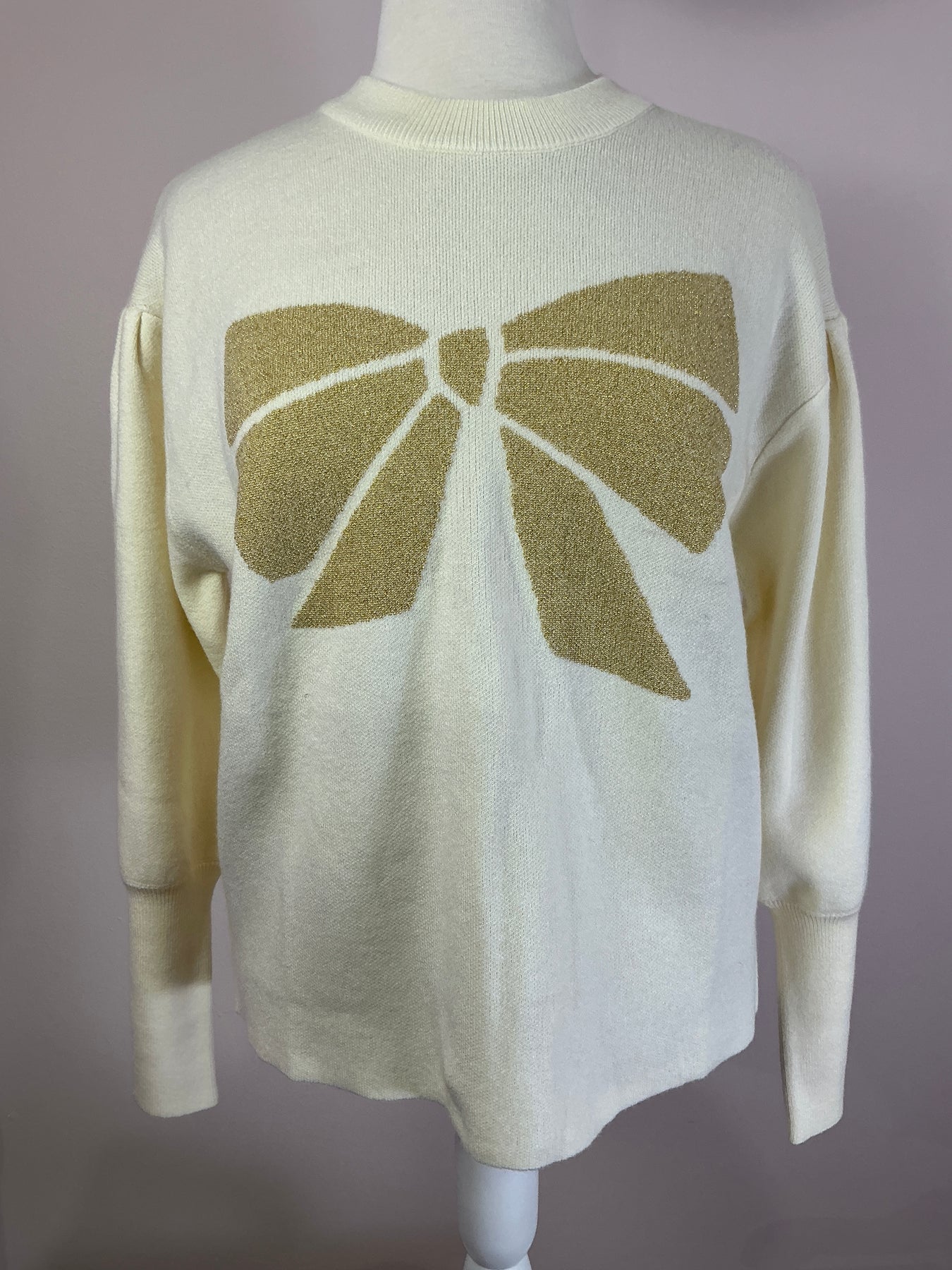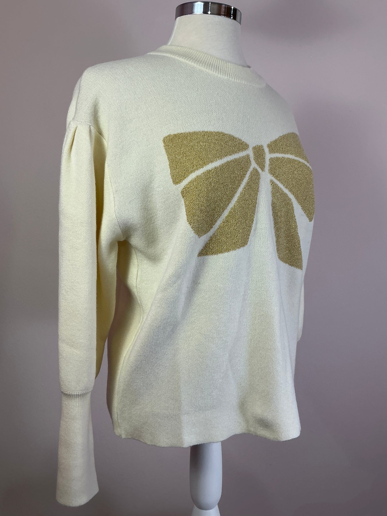 Elevate your holiday look with our unique style slight puff sweater. Festive and elegant, it features a cream base adorned with a gold metallic bow. Perfect for any occasion, from your favorite holiday festivities to welcoming the new year in style. Give yourself the gift of effortless sophistication. or just to show off your unique style. Soft and cozy!