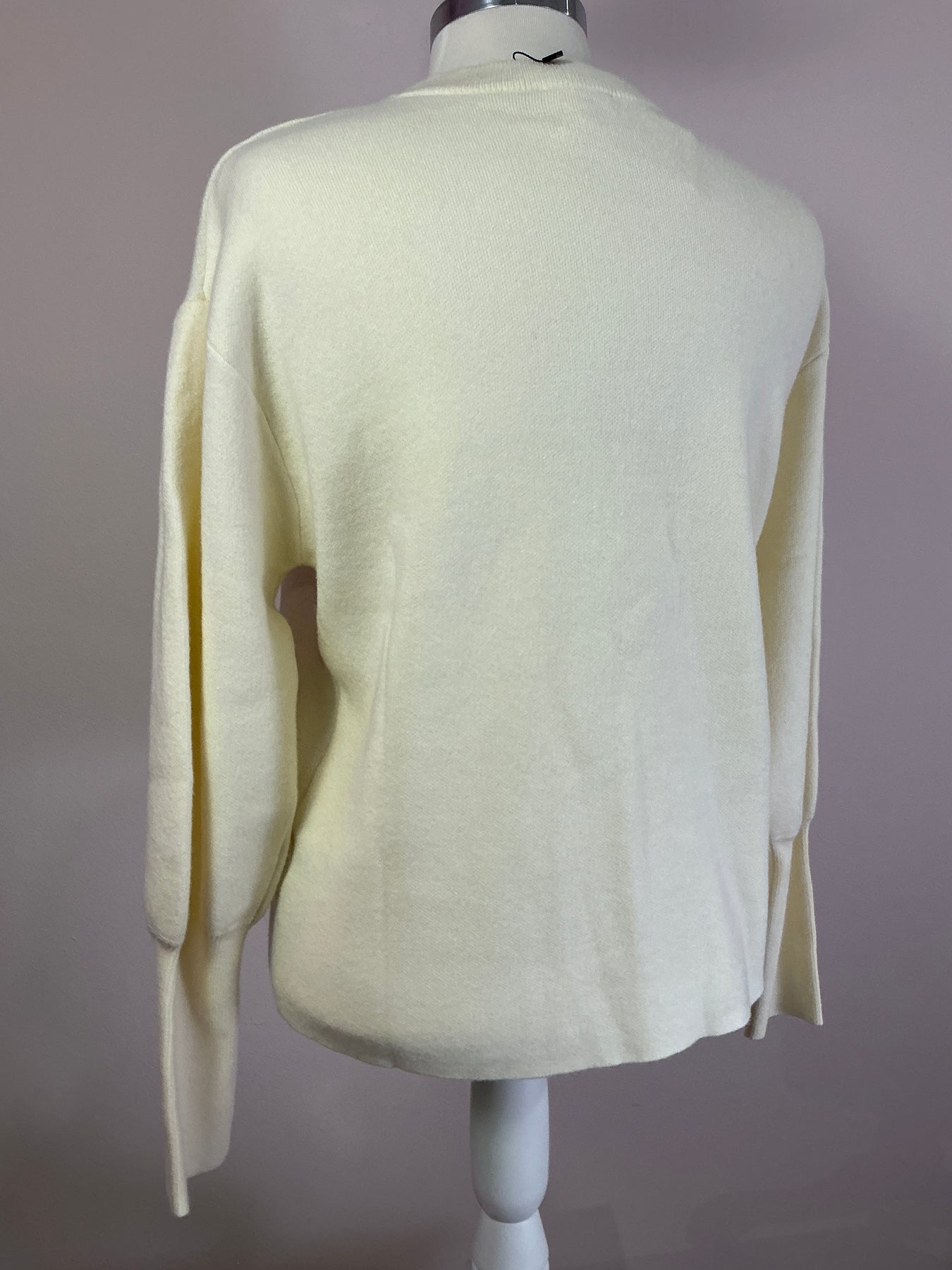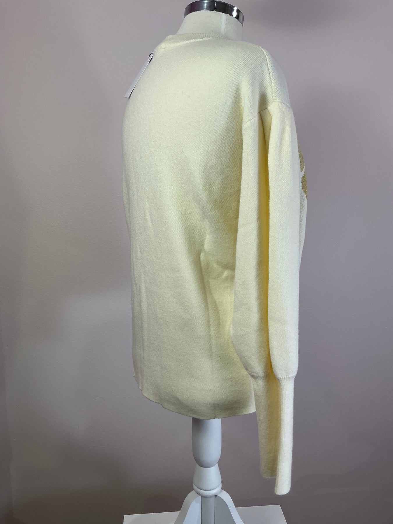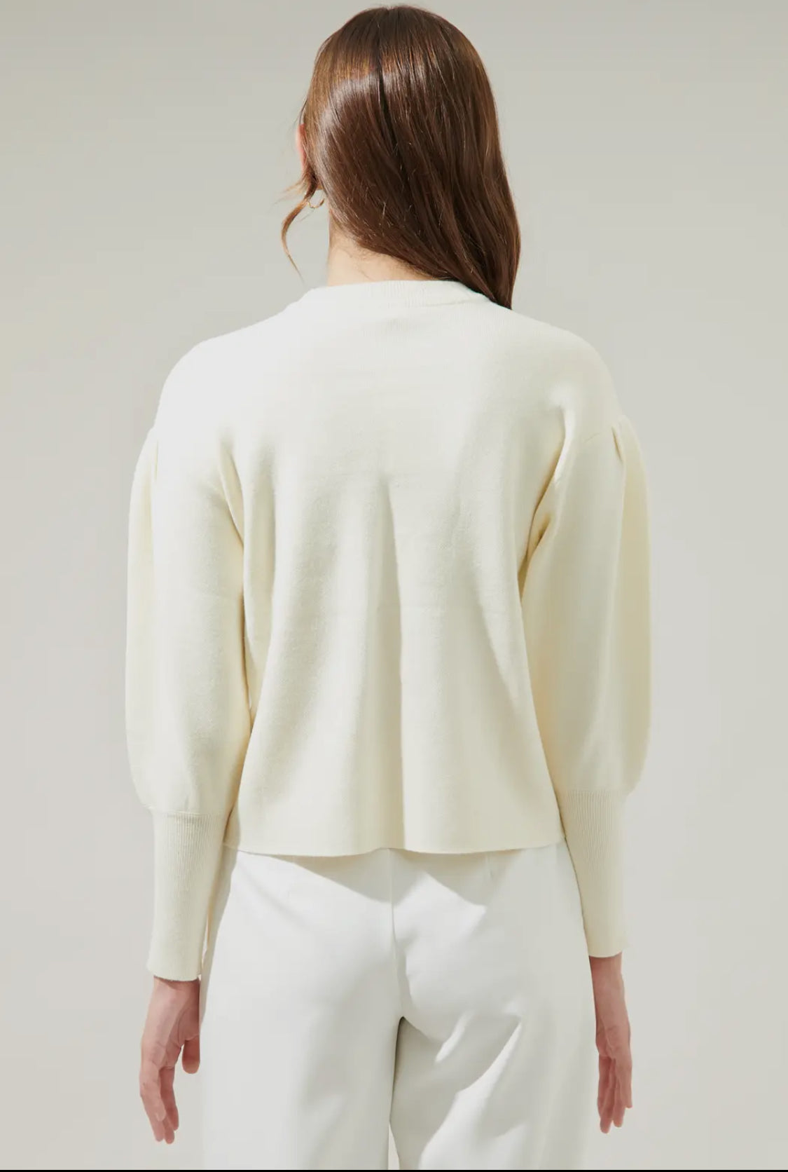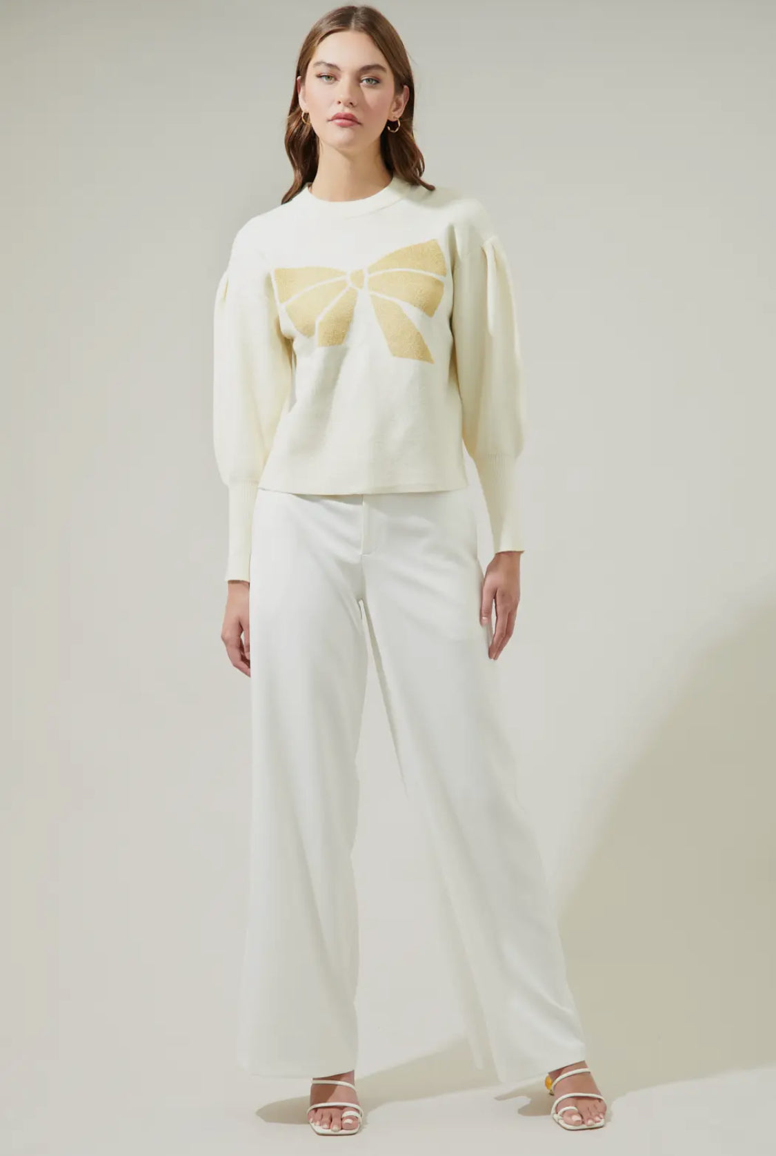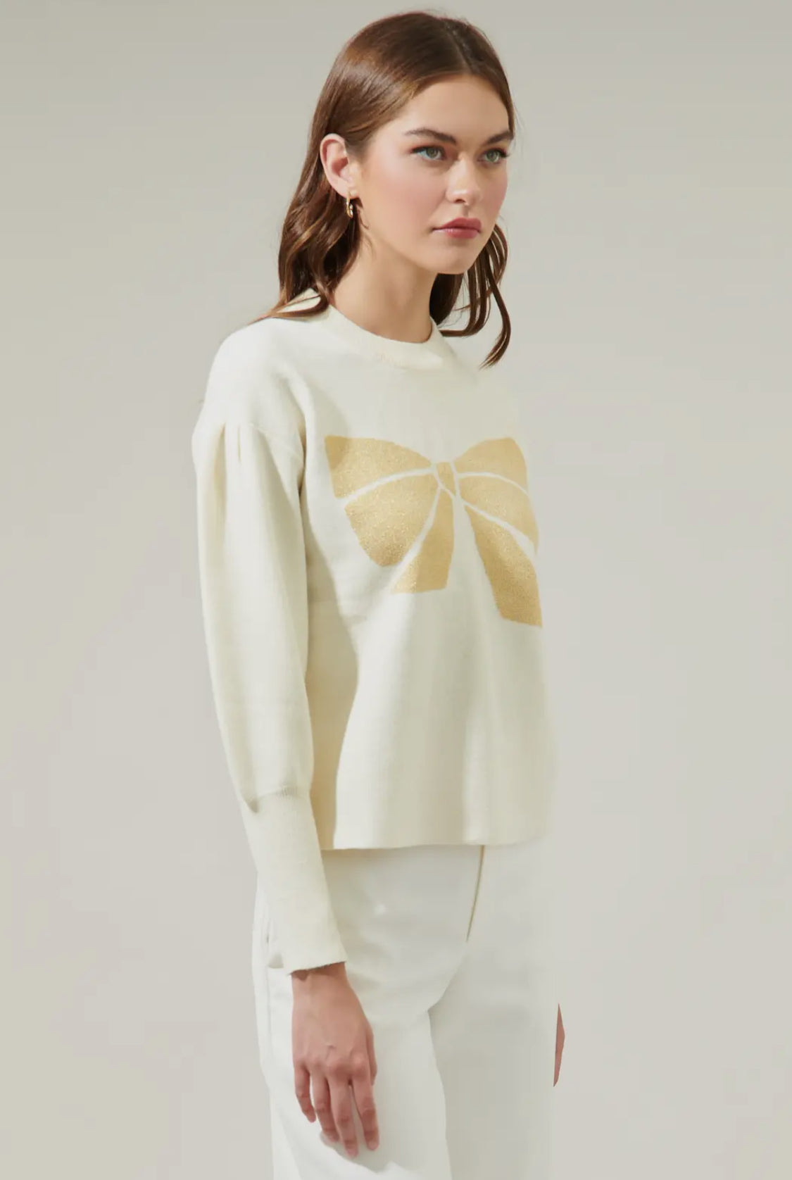 Elevate your holiday look with our unique style slight puff sweater. Festive and elegant, it features a cream base adorned with a gold metallic bow. Perfect for any occasion, from your favorite holiday festivities to welcoming the new year in style. Give yourself the gift of effortless sophistication. or just to show off your unique style. Soft and cozy!