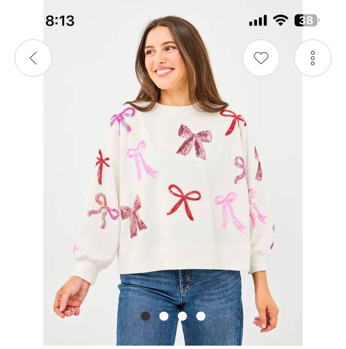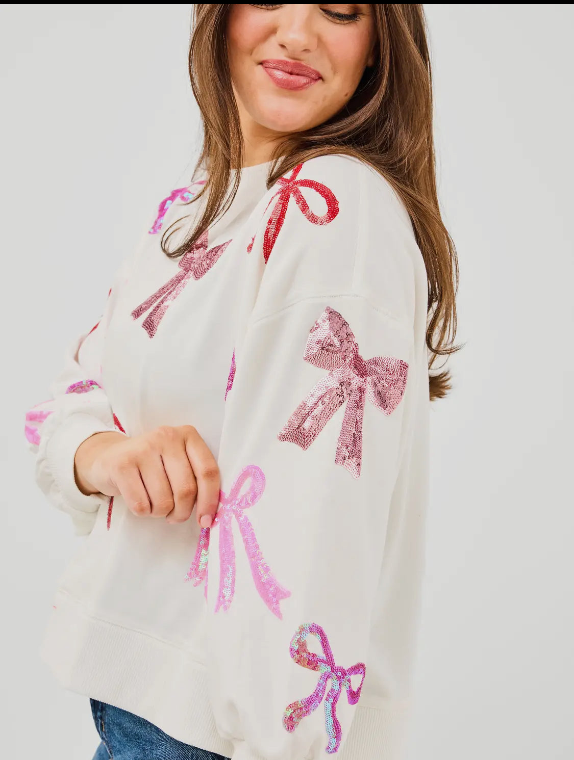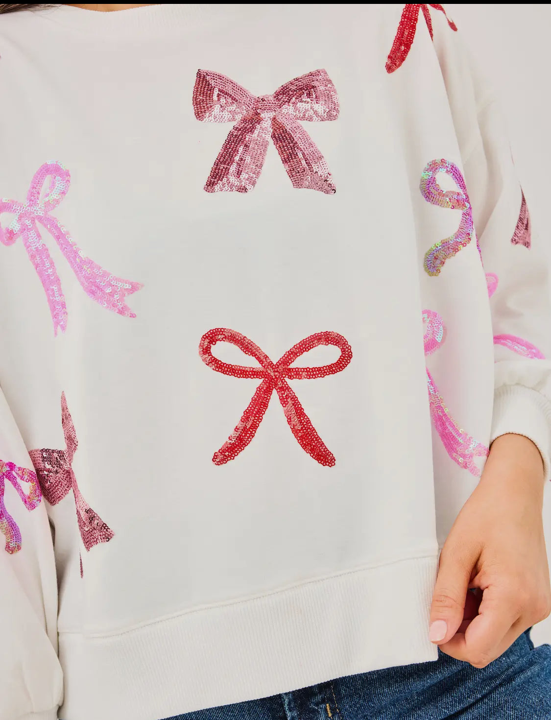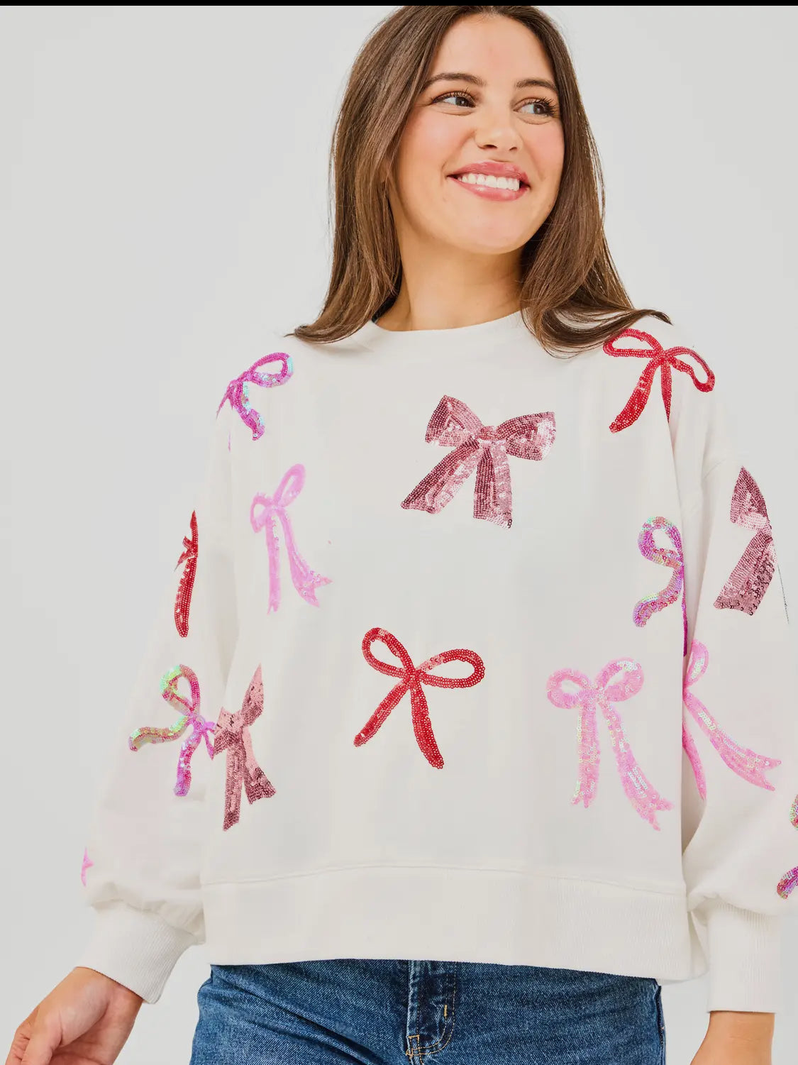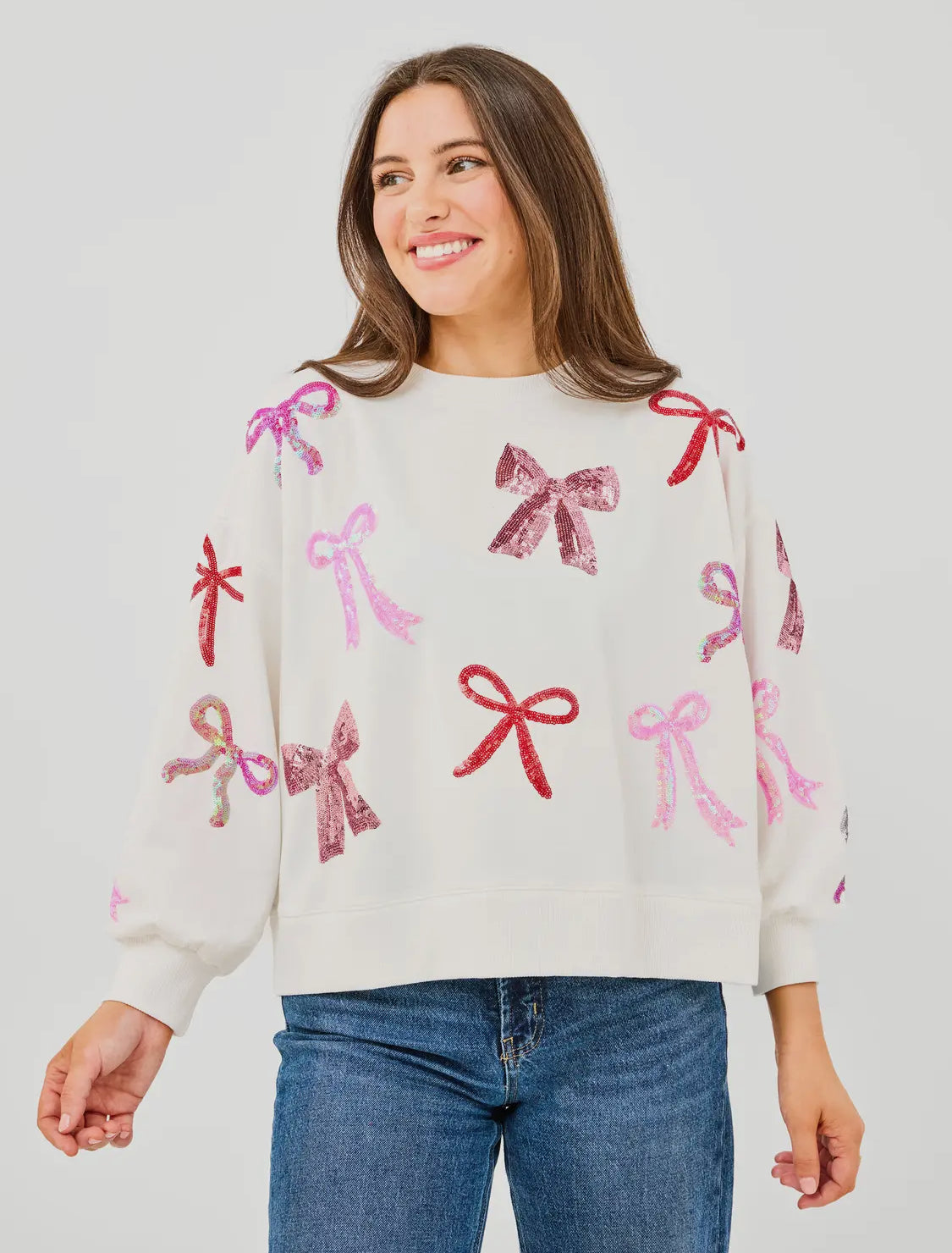Get ready for the holiday season with our Sequin Bows White Millie Sweatshirt! This lightweight and soft sweatshirt features sparkling sequin bows, making it the perfect way to add some festive flair to your wardrobe. Stay cozy and stylish all winter long!